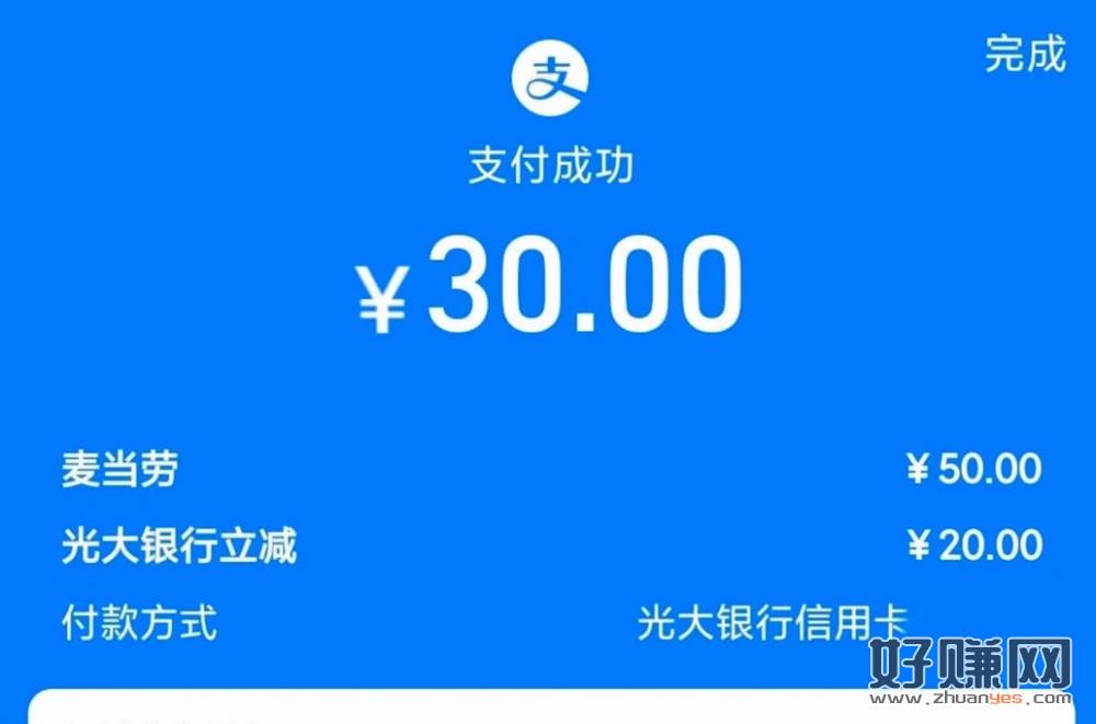 支付宝搜索「麦当劳」进入小程序,我的 - 麦当劳钱包 - 充值,充50元使用光大信用卡支付可满50-20元,名额还有!