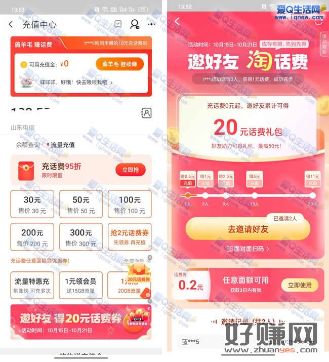 2.亲测邀请1人助力 0.5元成功充值1元话费 邀请3人助力 再次0元成功充值1元话费