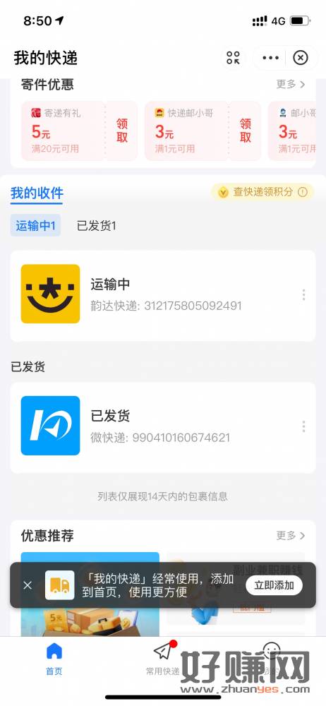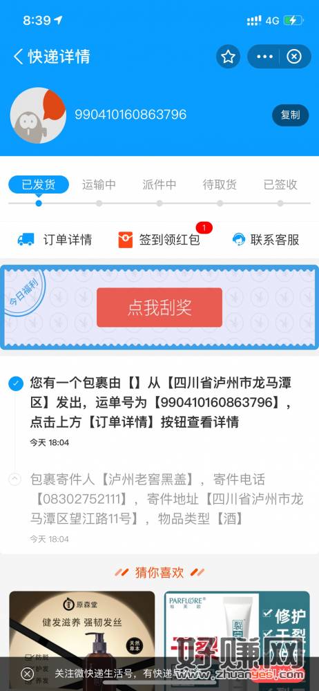 上次有个兄弟发的申领泸州老窖发货了,支付宝搜:我的快递,发的微快递(今天6:00发货的)