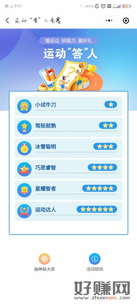 首先在微信搜索:民生银行运动圈,进入之后往下拉找到运动答人,进去之后会让你答题。这里我们需要注意的是尽量要两个设备,而且答题的时候一定要同时点不然的话很有可能题目不一样,同段位同时点题目是一样的,一个号试错另外一个号跟着正确答案,答案选错了会立马弹出正确答案,另外一个手机号跟着答案填。还有要注意的就是高段位和低段位尽量不要有两个以上的差距,这样会导致题目只有一道题是一样的其余的全是不一样的,差一个段位的话只有一道题目是不一样的,所以如果差了一个段位一定要把答案记牢。其次就是每过一关会有三次抽奖机会,会自动提示去抽奖如图三所示抽中什么全看运气但我觉得水还可以很容易中立减金,抽中立减金的话点我的奖品然后进去兑换,千万要注意一定要选民生银行借记卡支付不要选信用卡这一点一定要注意选错了的话没信用卡支付不了。一个账号通关的话大概能有10块左右,多号多撸可以绑定同一张民生银行,水还是可以的很容易中。你们没弄的度去冲