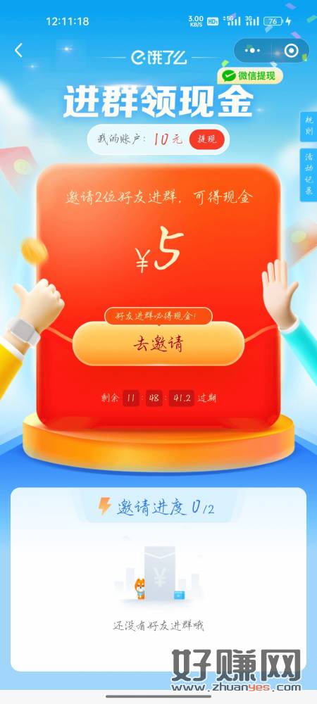 又刷新了!饿了么拉二人进群5元,悬赏平台挂0.2也有人做,放