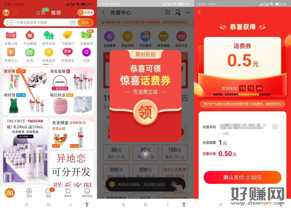 TB首页-充值中心 弹窗领0.5-1元话费券 更新了之前领的继续玩