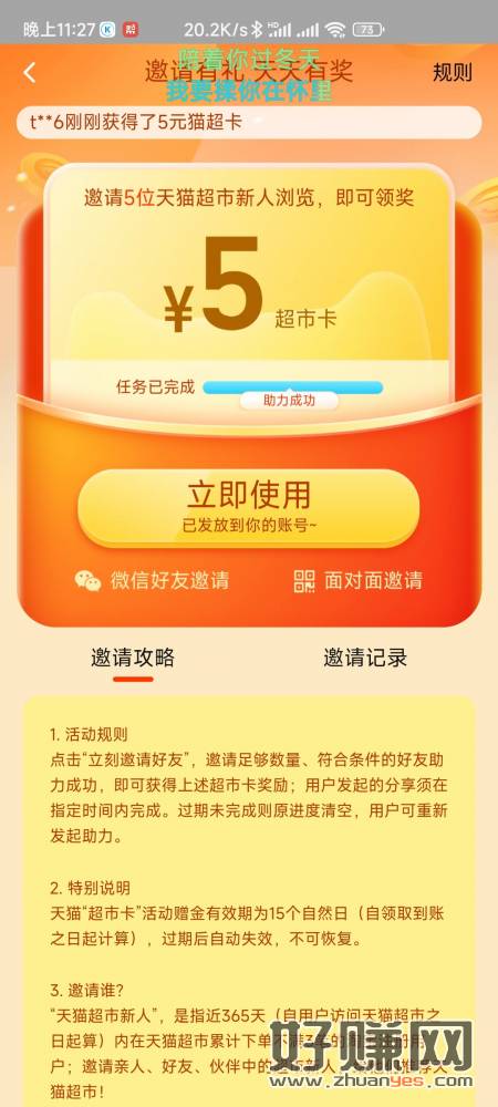 5天猫卡:天猫超市~我的~下滑邀请有礼~拉5个一年内在天猫超