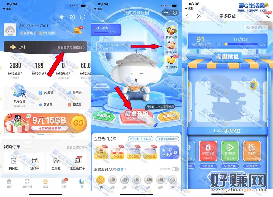 电信营业厅APP-我的-查看我的专属权益-等级权益-达到Lv3以上用户用金豆兑换各类视频会员即可-升级点喂食升级,去用金币升级