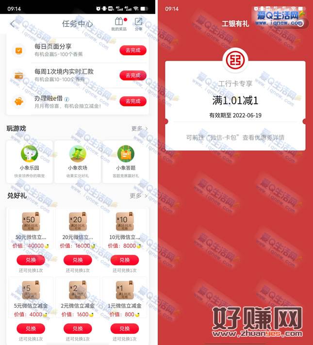 工行香蕉兑1-50元微信立减金 亲测1元立减金秒到