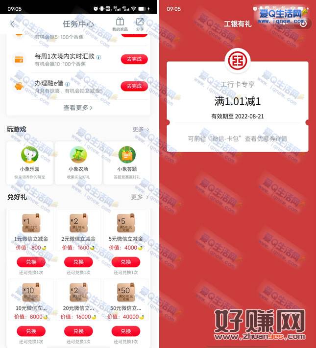 工商银行APP-搜索【任务中心】-下拉至底部-兑好礼-兑换立减金