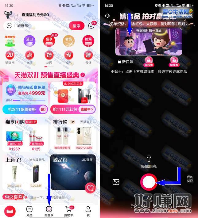 1.手机天猫APP-底部【拍立享】-顶部【猜商品 赢免单】-拍照出免单大奖 就可以0.01元下单了