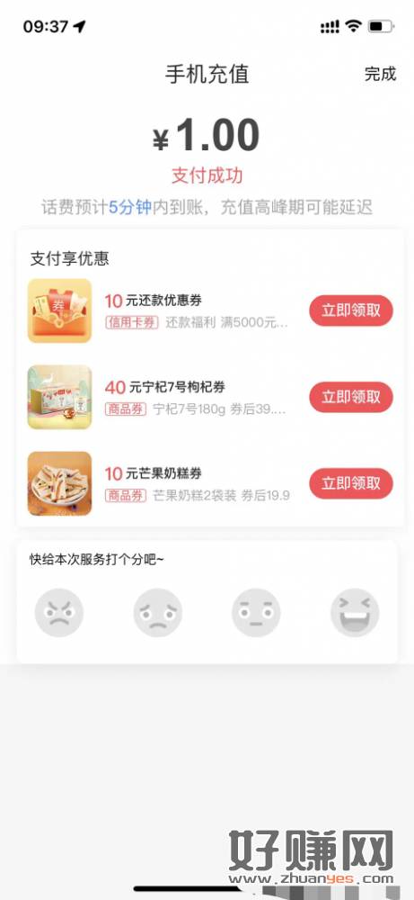 翼支付,充值1元电信话费,领取10元还款券 5000-1