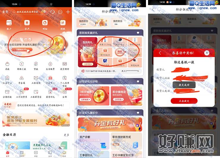 工行APP-首页顶部【积分狂欢季】下拉至【签到有礼】右侧抽奖-每日免费抽3次非必中