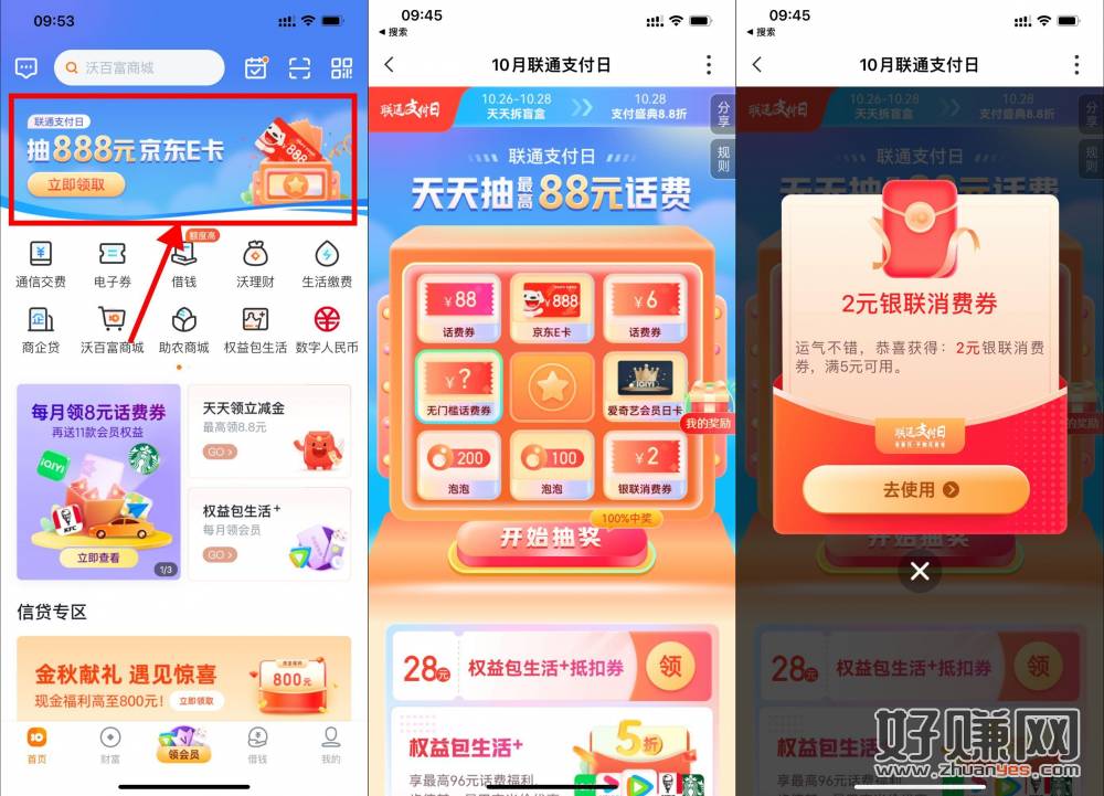 【联通支付日抽银联券或话费券】今天还能再抽!沃钱包APP->首页横幅进入->直接抽10减6元话费券或5减2元银联消费券