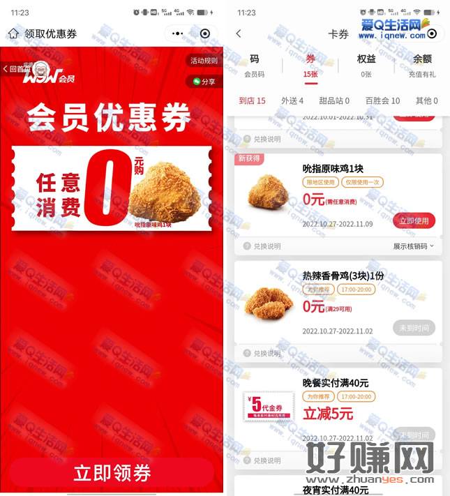 免费领肯德基吮指原味鸡1块 需随单消费使用