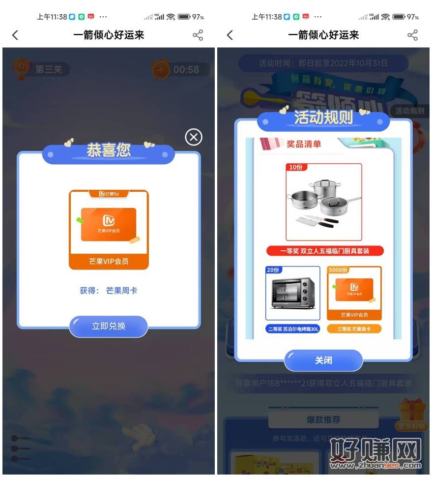 【农行一箭倾心抽芒果TV会员周卡】打开地址跳转到农行APP->玩3关小游戏抽会员周卡!
