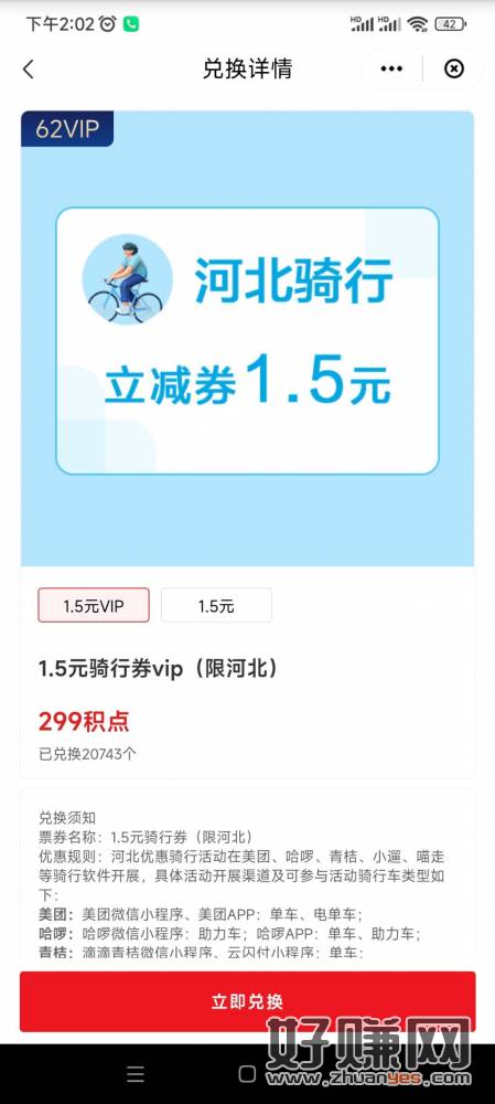 云闪付河北地区 vip可以兑换1.5元的骑行券 每周兑换5次 这个券可以通过微信美团单车充值 跳到云闪付款 套了