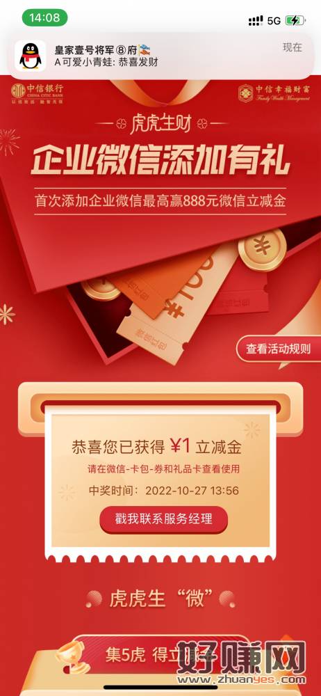 微信扫码 中信银行立减金最低1r 添加客户经理