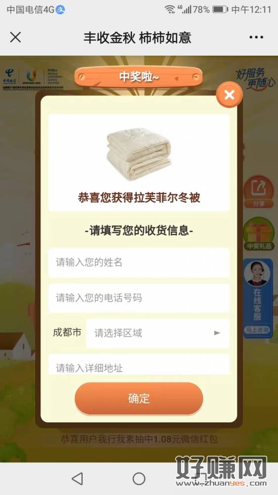 成都电信中了一个被子。只发成都市,怎么办。这毛不错啊,来个成