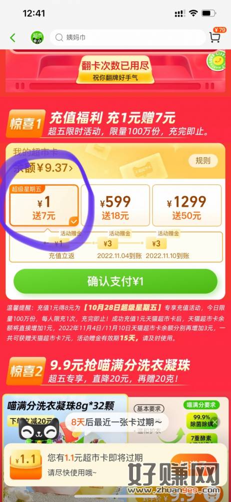 打开淘寳APP,点天猫超市,搜索【超级星期五】-充值1元得8元猫超卡