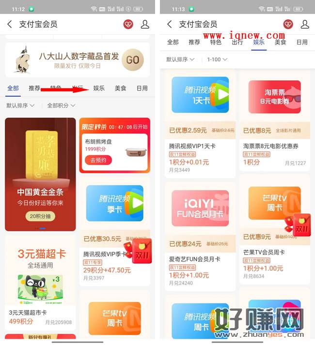 支付宝APP-我的-支付宝会员-娱乐-1积分+1元 兑换芒果/爱奇艺/腾讯视频vip周卡
