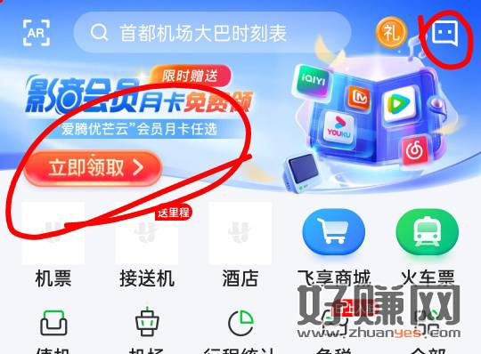 航旅纵横app,首页顶部有个开通钱包赠送视频会员一个月,开好后在首页右上角消息查看