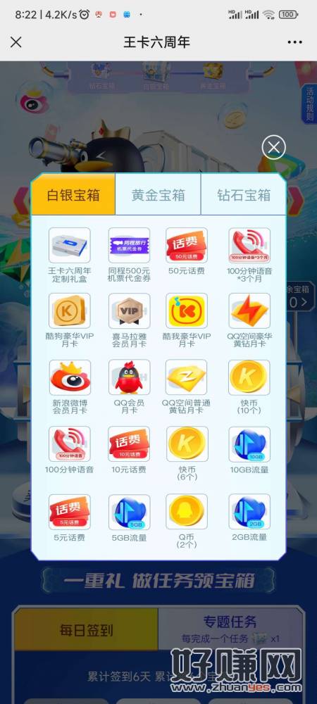 微信关注王卡助手公众号点击第一条推文:王卡6周年,进入下滑点击去领宝箱,每日签到宝箱可以领一个,做专题任务可以领15个,专题任务去完成后直接返回就可以领了,QQ会员、快币、酷狗音乐会员等你抽