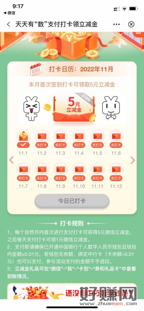 湖南中行数字人民币专区每天数币支付0.01得1元立减金,首次签到得5元