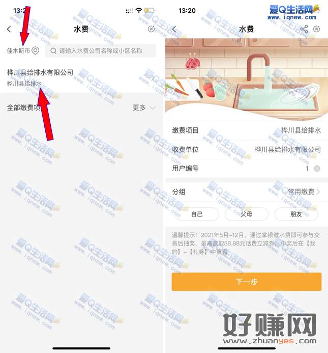 农行银行APP-首页“生活缴费”-左上角手动去修改位置到“佳木斯”市-下拉去交水费-选择“桦川县给排水”-编号输入“1”-缴2次0.01元可以抽奖2次