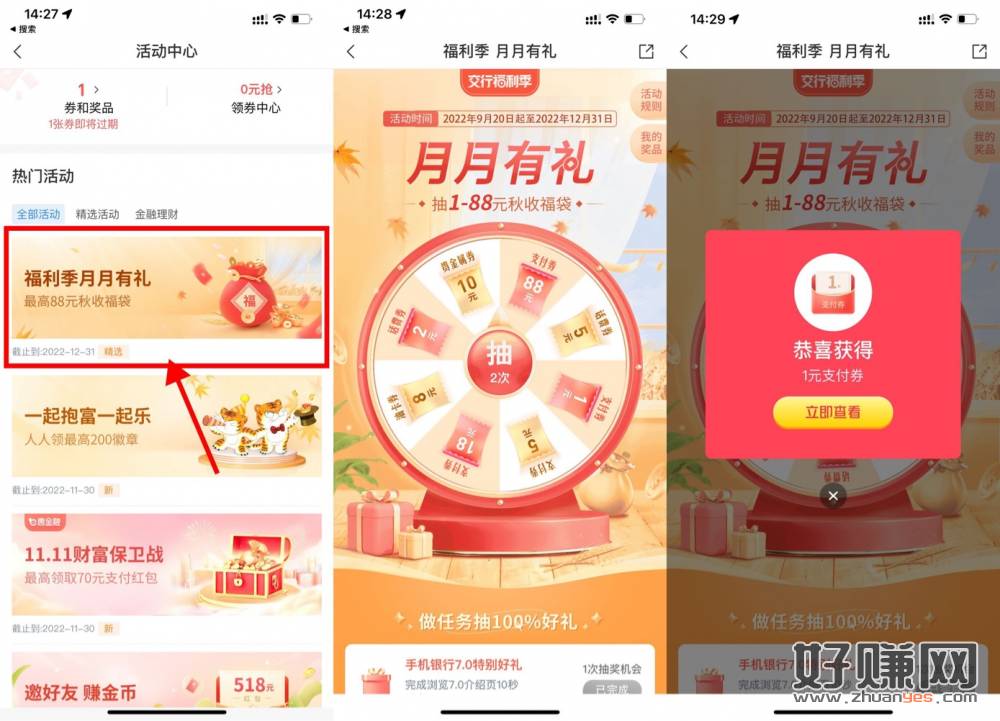 新一期!交行APP首页“活动中心”->福利季月月有礼->完成简单任务得3次机会->支付券需扫银联码才能抵扣