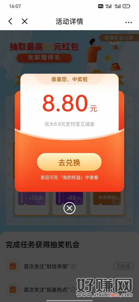 光大银行app -我的 -权益服务 -新客专区 -光彩陪伴礼 完成3个关注抽奖,最高可抽88元支付宝立减金