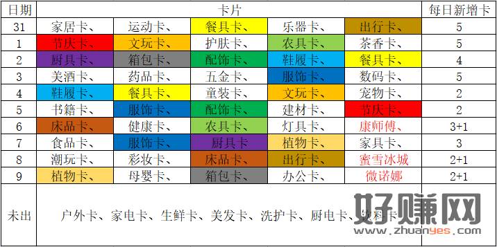 然后最下面这张图是这几天的开卡详细,目前还有7张卡没有出,这7张其中至少两张是必出的,11.9号出过的(植物卡、母婴卡、箱包卡、办公卡),11.10肯定是不会在出的。