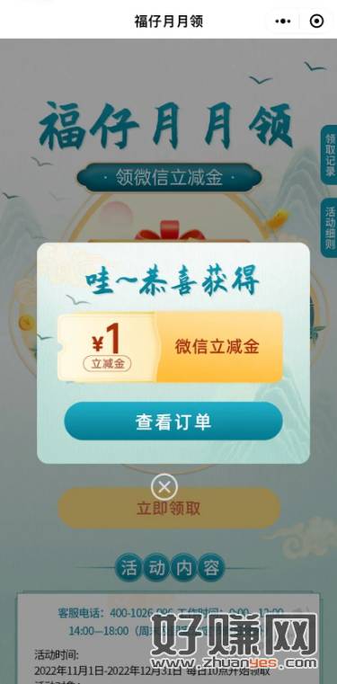 参与方式:中国银行APP-首页下滑至banner“福仔云游记”-进入游戏页面右侧悬浮框“福仔月月领”-可每月领取1次1元微信立减金(每日10点)