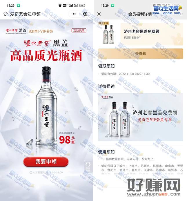 爱奇艺v5会员免费领泸州老窖 亲测已领取到货