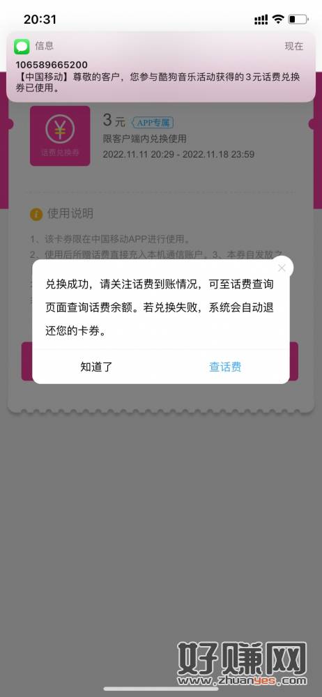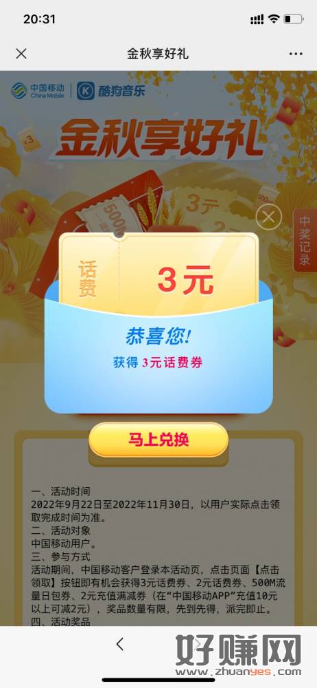 移动送话费券,需要app激活,充值秒到,去试试 。