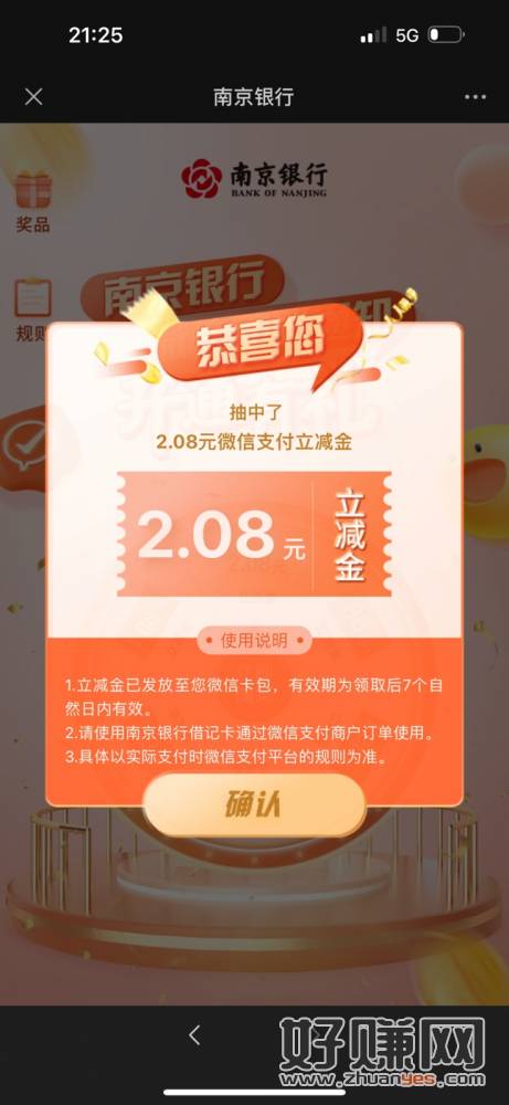 南京银行关注订阅号 可抽立减金额,固定送1元减金 我抽中2.08