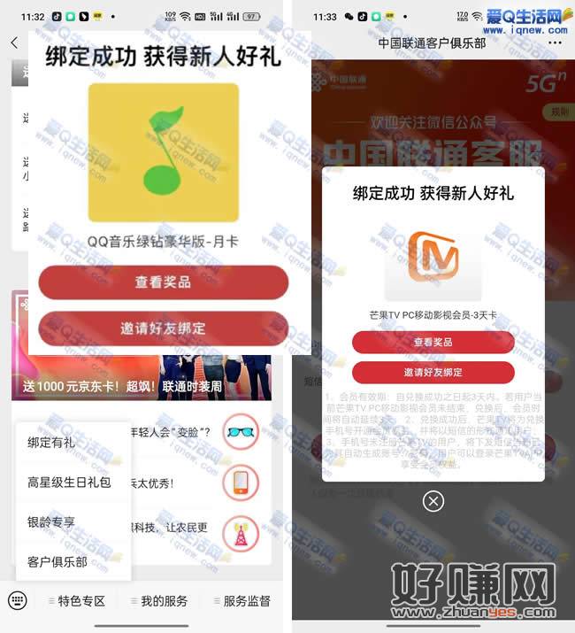 中国联通客服首绑福利 抽腾讯视频vip月卡/QQ音乐月卡/芒果tv3天vip