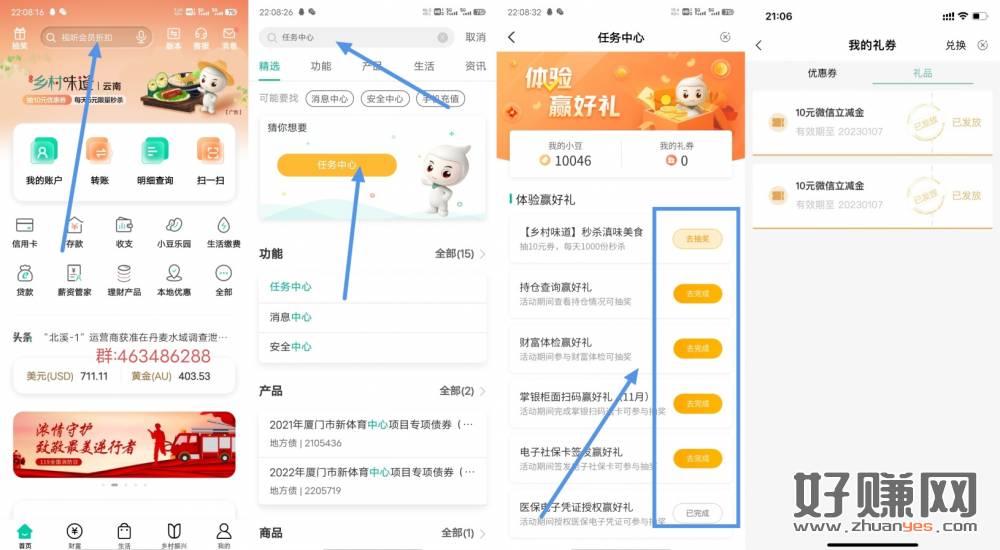 工行首页-点开选择地区分会-完成访问二个任务-给一个优惠券,