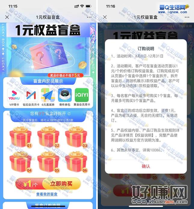移动1元拆盲盒 可开优酷会员周卡/爱奇艺会员周卡等 这个活动室中国移动用户去参加哦,用1元话费抽盲盒