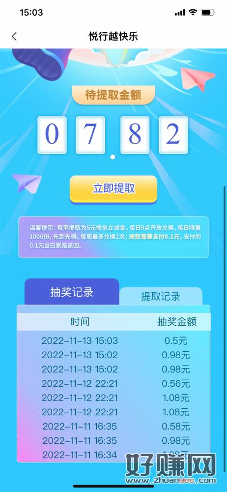 温馨提示:每笔提取为5元微信立减金。每日9点开放兑换,每日限量1000份,先到先得,每周最多兑换2次;提取需要支付0.1元,支付的0.1元当日原路退回。