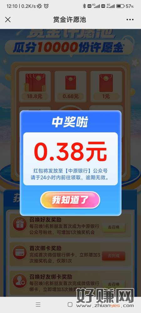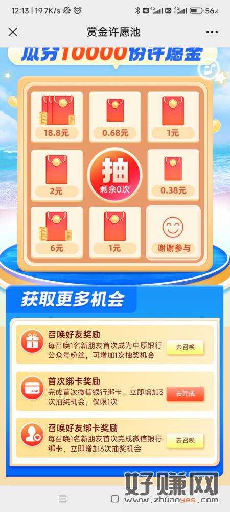 关注中原银行,没参加过得抽一次起码0.38,补包了。上限抽奖
