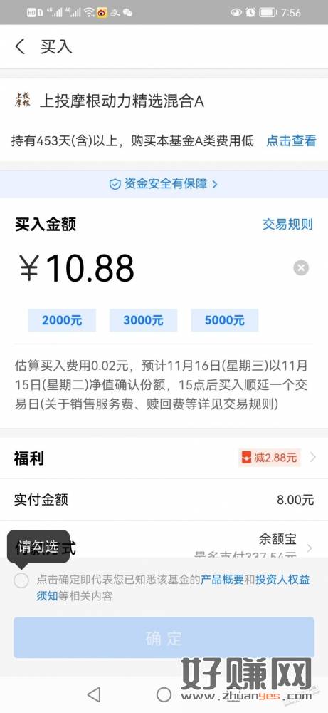 上投摩根基金财富号,粉丝中心,加自选,抽取 2.88,投10.88-2.88抵扣,确认即赎回,赚2.5以上。