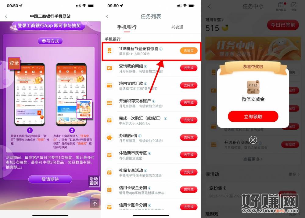 【工行粉丝节抽3~111.8元立减金】今天还能再抽一次,运气好就是111.8元!工行APP->我的->任务中心->登陆有惊喜直接抽最高111.8元微信立减金