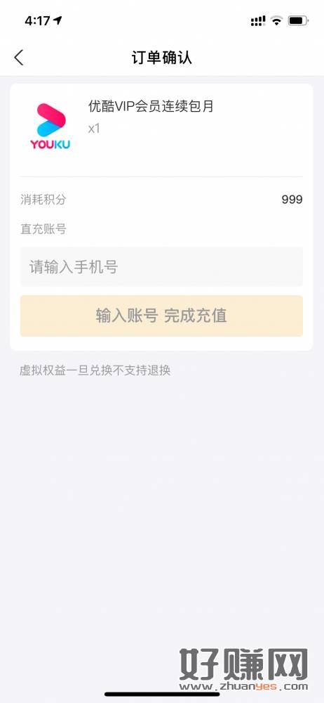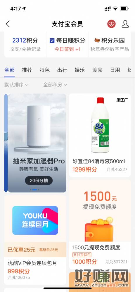 支付宝有1000积分的支付宝会员找到999兑换优酷月卡,直冲