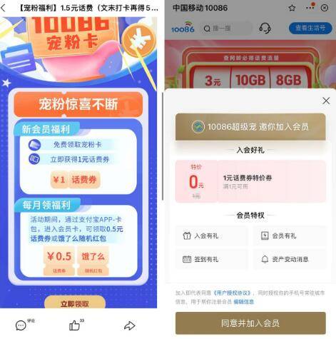 支付宝APP扫码->立即领取->跳转到小程序入会领取->在“中国移动APP-我的-卡券”中激活秒到1元话费