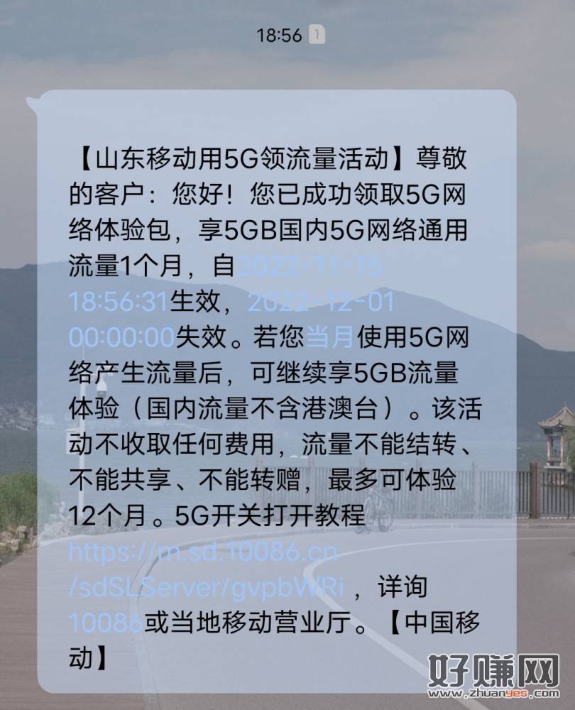 尊敬的客户,您好:您周边区域已覆盖中国移动5G网络啦!菏泽移动邀约您免费领取65G流量无需费用到期自动取消,点击链接