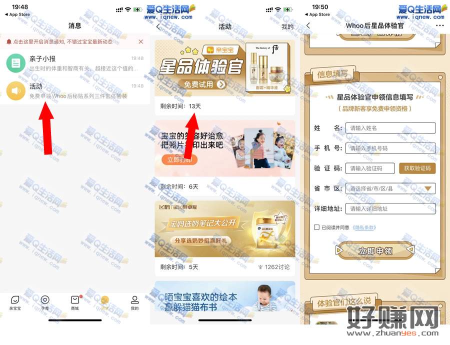 活动地址:亲宝宝APP-我的-去登陆-点击底部消息-活动进入-直接去填地址领取即可