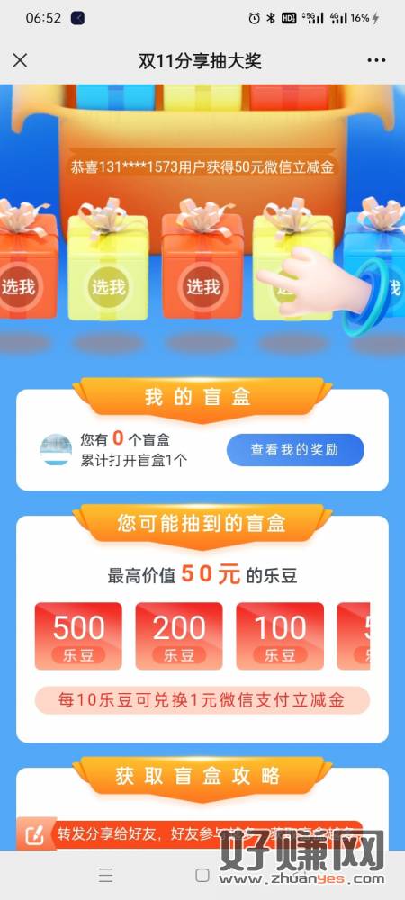 双11抽盲盒赢50元最高乐豆奖励