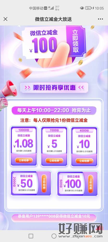 活动期间,客户通过以上活动路径参与“微信立减金大放送”活动即有机会抢兑1.08-100元微信立减金。抢兑时间:每天10:00:00—22:00:00,活动期间共23500份微信立减金,每人最多可成功抢兑1次,先到先得、抢完为止。