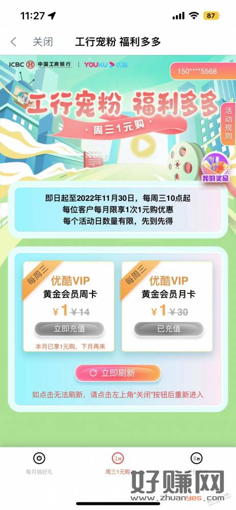 工行APP1元买优酷月卡