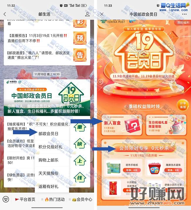 2.新老用户都可以参与 活动页面下方的 会员限时专享 0元秒杀活动 活动于11月19日10点开抢【可抢大米、手帕纸、洗衣凝珠牙膏实物】
