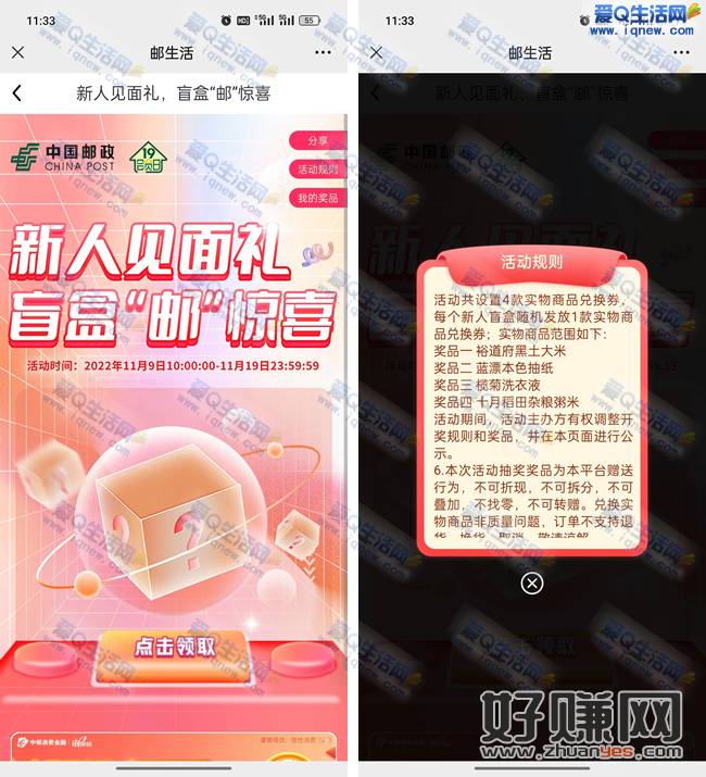 1.微信关注【邮生活】公众号-菜单栏【热门活动】-【邮政会员日】-新人盲盒-新人可以参与抽大米、洗衣液、抽纸实物