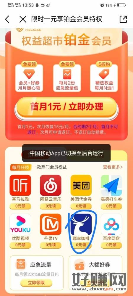 中国移动app,首页点权益专区,横幅,进去1元开通铂金会员