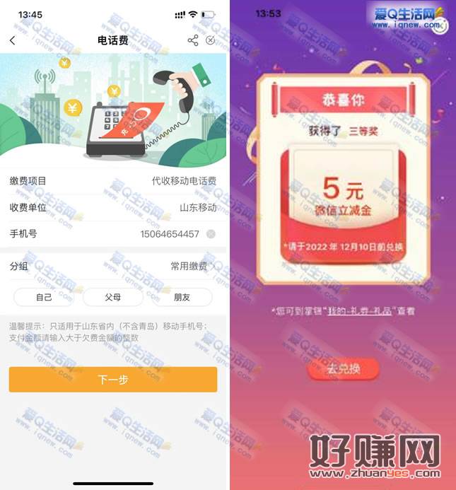 农业银行APP--底部生活-生活缴费-左上角手动改位置为潍坊市-去交电话费-选择山东移动-输入下方电话号码去缴费0.01弹抽奖